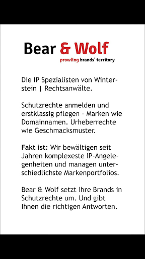 Bear & Wolf. Die IP Spezialisten von Winterstein | Rechtsanwälte. Ins Leben gerufen für Ihre Brands. Maßgeschneidert. Von erfahrenen Intellectual Property Spezialisten. Schutzrechte anmelden und erstklassig pflegen – Marken wie Domainnamen. Urheberrechte wie Geschmacksmuster. Seite an Seite. Mit Standorten in England und Deutschland. IP-Spezialisten überall. Auf Ihrer Seite.