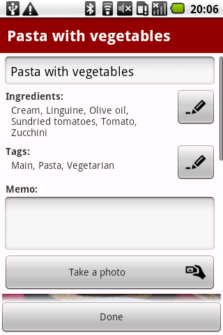 Take recipe notes quickly and easily. If you like cooking and collecting recipes but find that writing down recipes and organizing their photos take a lot of effort, you are not alone. The app remembers the ingredient names you enter, so that next time they can be autocompleted easily. You can tag recipes and take photos using the built-in camera of your phone.