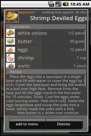 In the menu you will find the recipes you already have chosen. This activity features a text to speech function that will read the recipe out loud(so you wouldn't have to operate your device to often with dirty hands).