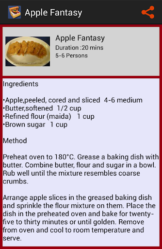 Recipe is a user guide to cooking for Vegetables and Deserts recipes. Application provides simple guidance to preparing food with detailed information about authentic cooking ingredients, nutritional information, procedure, notes.
