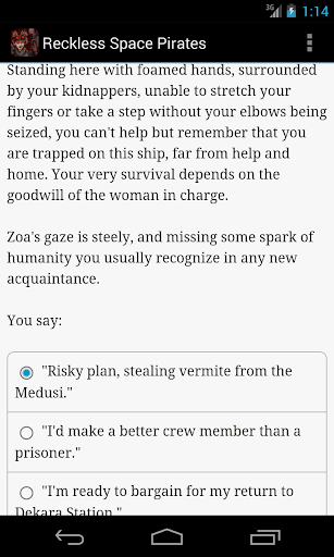 Will you survive the infamous space-slime pits? Will you earn the respect of the crew, or even start a romance with a space pirate? Can you negotiate with the fungoid aliens, despite linguistic and cultural barriers? Or will you blast their rubbery guts, plunder the slime pits, and retire in luxury?
