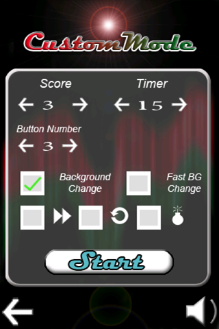 Custom Mode allows players to choose the Time, Score to be reached, maximum button number, and other settings to play a level of their own design for increased ease or challenge.