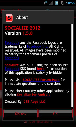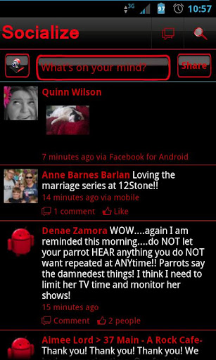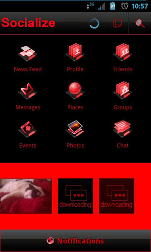 Connect to Facebook with style. Arent you tired of the boring white screen and ugly icons. Try Socialize for Facebook with black backgrounds, red and white text, and HD custom designed icons. The sleek new design offers a bit of style as you Facebook away with all your friends. Show off just how stylish and different you are while enjoying all the comforts that Facebook has to offer. Everything is fully customized for speed and looks. Every screen looks crisp and clean. There are others out there that try to imitate the same look and feel but they just don't cut it. Socialize for Facebook offers all this while keeping the size down to a minimum and making the application run faster. Even the widget has the same black backgrounds with red and white text and custom HD icons. So dump the old and dreary and try out the stylishly new Socialize for Facebook.