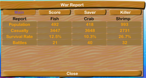 On a small reef in an unknown part of the ocean, 3 sea creatures are fighting for survival. The fight has come to a standstill, no one is winning. Come and aid one of the three creatures and help them win this survival of the fittest. Which creatures will you aid? The quick and nimble fish who survive by eating shrimp and evading crabs. The slow but handy crab who uses small rocks to leverage their immobility. Or the tiny shrimps who possess a mysterious power to encapsulate the crabs. Reef Wars features a small battle field where 3 different factions are continuously fighting each other for domination. The player influence the outcome by spawning individual faction members into the battle. Take total command of the battlefield or just lay back and let the fight switch sides on its own. It's easy to get started, but takes a little bit of strategy to ensure a true victory.