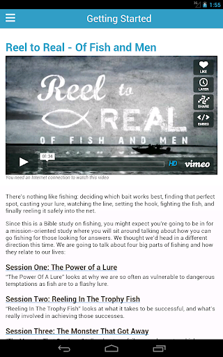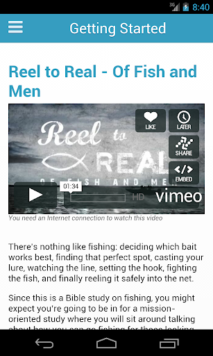 This app serves as a companion discussion guide to the video Bible study titled "Reel to Real—Of Fish and Men".