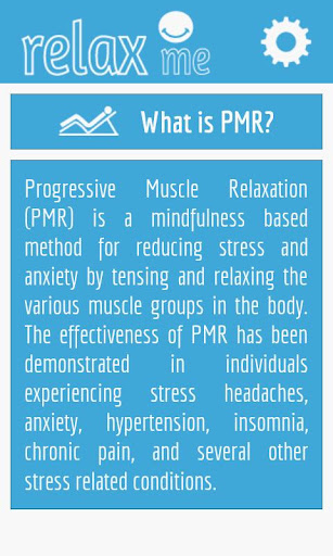 Relax Me is designed to help you energize and unwind, anywhere, at any time. It is based on a well-researched therapeutic technique called Progressive Muscle Relaxation (PMR). PMR is a mindfulness based method for reducing stress and anxiety by tensing and relaxing the various muscle groups in the body. The effectiveness of PMR has been demonstrated in individuals experiencing stress headaches, anxiety, hypertension, insomnia, chronic pain, and several other stress related conditions.