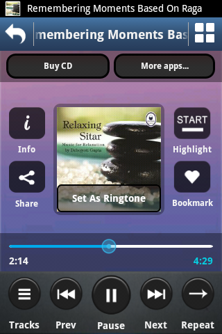 This CD contains Relaxing music played on Sitar with different nature sounds in background. It gives you near to nature feel.