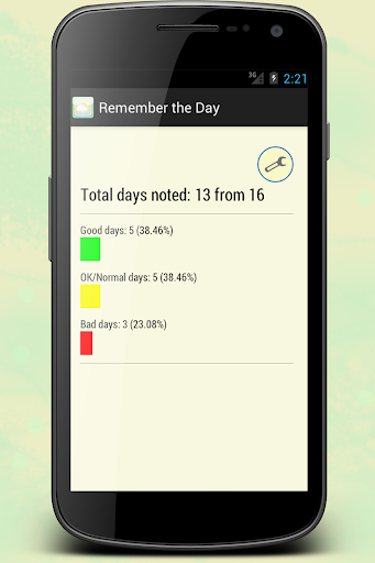 All days are divided into three categories (Good, OK/Normal, Bad) which roughly describe the users mood or feelings on a particular day.The user can add a new note for the current day, view any previously noted day, change the current note during the day* and view some basic statistics about the amounts of the three types of a day.