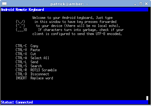 Remote Keyboard allows you to connect your desktop computer's keyboard via wlan (can be forwarded over USB via ADB) to your android device and control it comfortably through any telnet client.