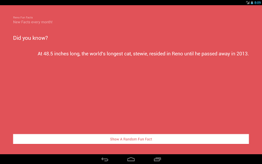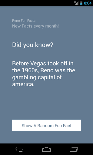 Fun facts about the Biggest Little City in the World! This app allows you to see random fun facts about Reno, Nevada.
