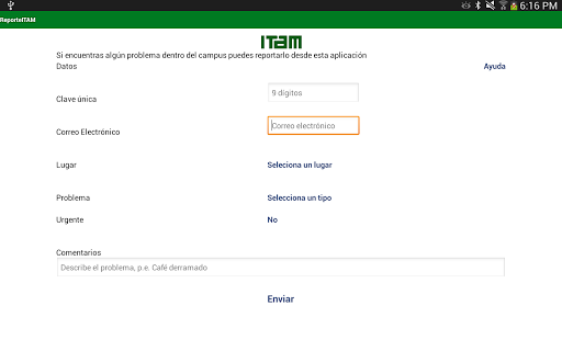 Aplicación diseñada para la comunidad del Instituto Tecnológico Autónomo de México (ITAM) que encuentren incidentes o fallas dentro de la Institución