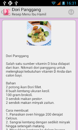 Aplikasi ini berisi aneka resep menu makanan untuk ibu hamil yang diambil dari website www.ayahbunda.com
