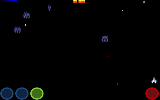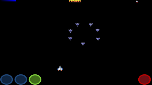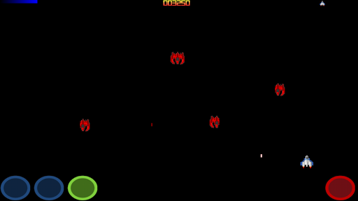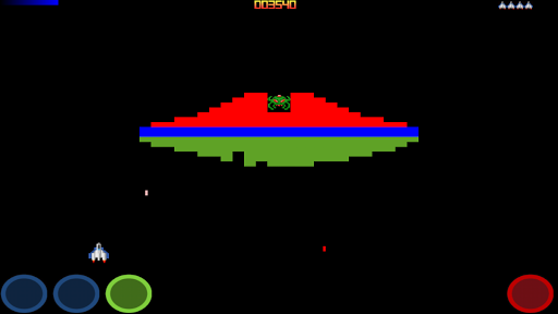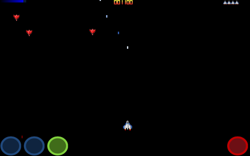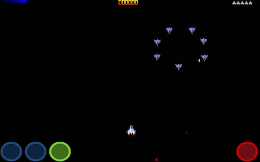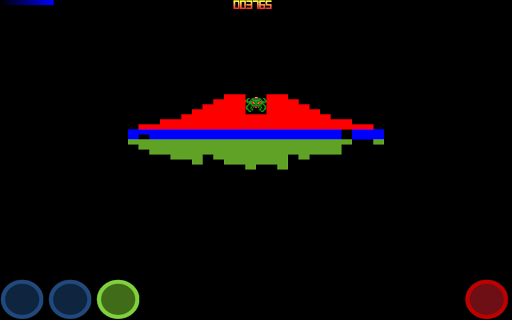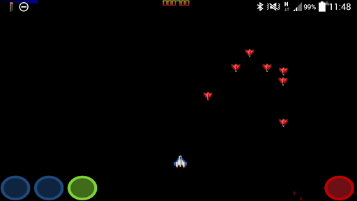 PLAY TIP: Blue buttons: Move left and right. Green Button: Activate shield ( no moving ). Red Button: Fire.