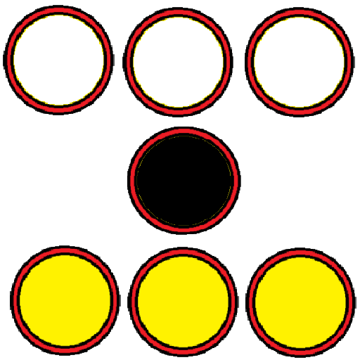 Move the white or yellow balls to empty house (black ball). It is allowed to skip a ball. The white balls jogging apaneas right and the yellow balls move up just to the left.