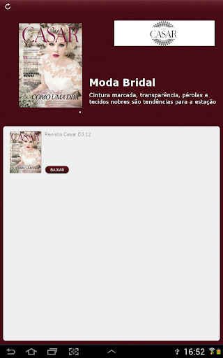 Revista Casar é um guia completo para sonhar, idealizar e comemorar. Apresenta todas as novidades em decoração, vestidos, doces, bolos, convites, beleza, tudo para sua festa. Em cada edição apresenta um concurso cultural para presentear seus leitores. A periodicidade é semestral e circula nos meses de Maio e Outubro. Em cada edição, é realizado um editorial de moda bridal assinado por renomados estilistas.