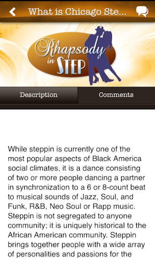 Welcome to the first Chicago Style Steppers app and we think it’s HOT! Rhapsody In Step App now available via a FREE download! The Rhapsody In Step app will be about - all things Chicago Style Steppin; the Dance, the Music and the Life. And now, relevant information right at your index finger tip. How cool is that?