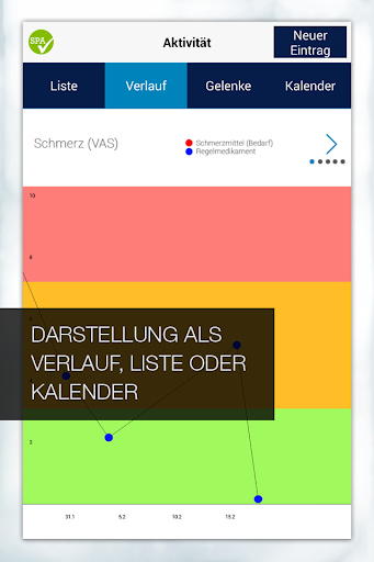 Die App wurde speziell von Rheumatologen entwickelt, um Patienten zu helfen ihr Rheuma selbständig und optimal zu kontrollieren. Durch intuitive Nutzerführung, einfache Grafiken und Symbole erhält man dank der App einen klaren Überblick über die Schmerzwerte in Verbindung mit Morgensteifigkeit und Medikamenteneinnahme.