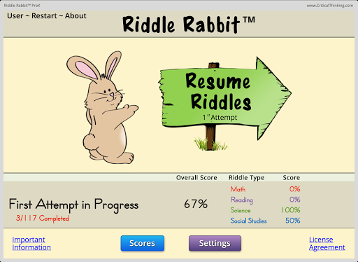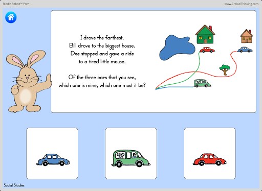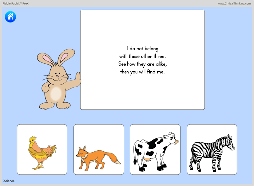 Riddle Rabbit™ develops skills in reading readiness, science, math, and social studies using five basic thinking skills: