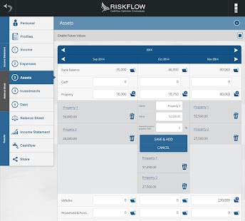 The Riskflow Cashflow application allows beginners and novices to log-on on a mobile device, tablet or the web and manage their financial needs anytime and anywhere. It has an easy to use interface that allows a user to add their values and assumptions for income, expenses, assets, debt or resources and then it calculates your results and displays them on your income statement, balance sheet and cash flow statement. The results can be viewed either month-to-month or year-to-year for a 5 year period.