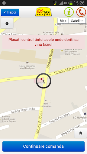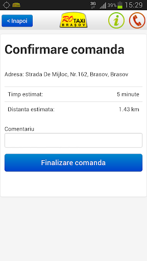 Pur si simplu lasi GPS-ul telefonului sa-ti gaseasca pozitia corecta (sau asezi tu harta in pozitia corecta), si iarasi, in cateva secunde, vei primi raspunsul flotei, impreuna cu timpul estimat de prezentare.