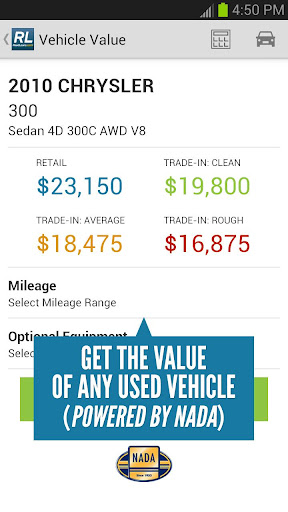 Want to find out the retail or trade-in value of a particular used vehicle? You can either scan the VIN barcode, enter the VIN, or search by year, make and model to get the vehicle pricing, powered by NADA. NADA provides vehicle pricing that most reflects the market. Find the right vehicle in your budget or know what your vehicle is worth to trade-in or sell.