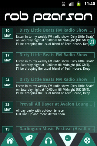 The ultimate app to keep up to date with true ambassador of House and Techno music - Rob Pearson Rob Pearson’s dedication and contribution to the UK’s underground House and Techno scene is beyond question. Since the early 90’s, from his South London base Rob has been responsible for helping to shape the Tech House sound synonymous with the capital. His productions have been released on genre-defining labels such as Wiggle, Plastic City, Artform and Sounds of Juan, as well as his own long-running Evasive Records and it’s sub variants. Be the first to get the latest Rob Pearson NEWS, UPCOMING GIGS, DJ MIXES, PHOTOS & VIDEOS, and NEW MUSIC… With the Rob Pearson app you can get the latest information on Rob's FM Radio Show 'Dirty Little Beats' and the show's many different feautured guest DJs and labels from each episode. THIS APP INCLUDES · Music Player for latest & upcoming releases · Photo gallery and video archive · Rob Pearson Links · Event dates and ticket information · A frequently updated news feed