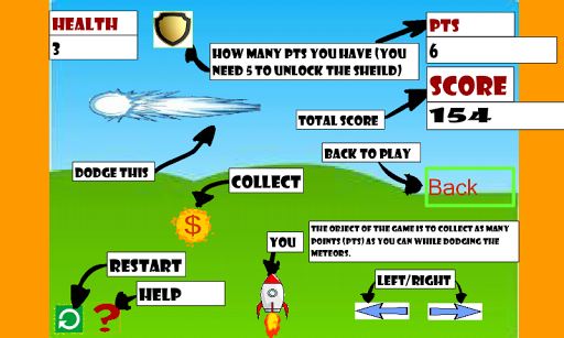 Dodge the falling meteors in your little rocket on its way to the moon, collect the coins to buy power-ups and get a higher score. Good luck.
