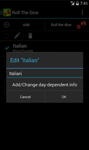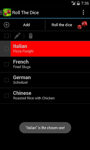 - randomly pick any item by shaking or pressing the "Roll the Dice"-Button
