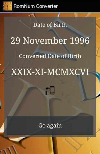 Use this app to convert roman numerals to natural numbers. Features include conversion of date of birth, and real-time conversion of date and time.