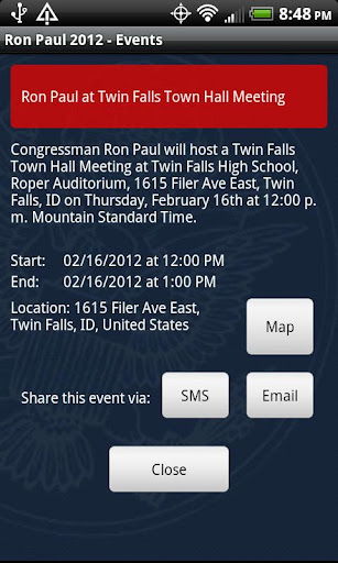 * Real time event calendar: Where Congressman Paul is campaigning, get map and driving directions and share this info via SMS or Email.