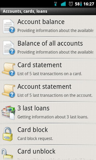 • get a mini statement of accounts and cards, find the available balance on accounts and deposits, to obtain information about the parameters of loans;