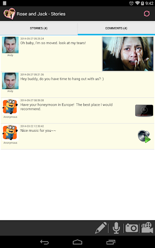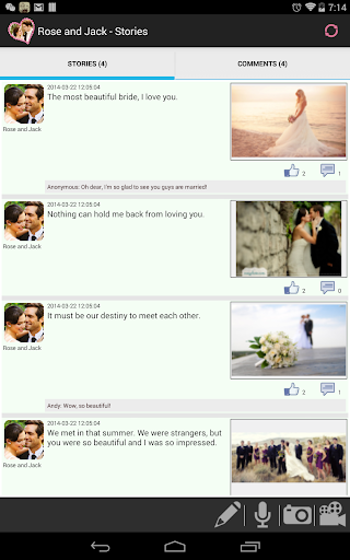 As owner of the app, Rose and Jace can post love stories with text, pictures, audio and videos. Families and friends can easily read the stories and reply, or post comments in the form of text, picture, aduio and video. Also, before the wedding day, families and friends can send multimedia greetings to Rose and Jack.
