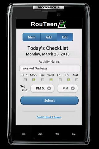 Introducing "RouTeen" beta version. Use your kid’s phone to keep them on task. Parents simply load the app on their child’s phone and enter their Must-Do activities. Then, let the kids check off each activity, and the app will notify parents when completed or falling behind.