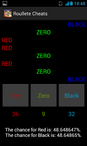 This program helps you to understand the "never-loosing" roulette tactic. It shows you how many blacks and reds were, and calculates the chance , what color will fall. Good for practicing and for internet casinos, not recommended in real one. Everything is explained in about page, you can get there through menu button. Works perfectly offline.