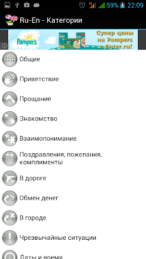 * База фраз, отсортирована по категориям, что поможет быстрому поиску необходимой информации в зависимости от ситуации, будь то заведение знакомств или разговор с официантом;