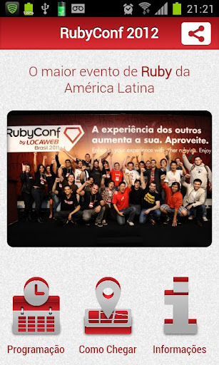 Aplicativo móvel desenvolvido pela Geeks Group para o Evento RubyConf 2012, realizado entre os dias 30 e 31 de agosto no Centro de Convenções Frei Caneca em São Paulo (capital).