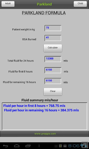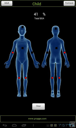 A critical component when assessing a burn and planning resuscitation is the careful examination of all body surfaces. The "rule of nines" is an accurate method of estimating the total body surface area involved. Fluid resuscitation is also a critical component and this application will assist you with both! Included are Adult and Child RON calculators and a Parkland Formula tool. Perfect for EMT's Paramedics, Nurses, Physicians or other health care providers!