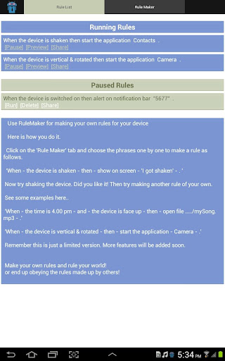RuleMaker helps you to make rules for your device such as " When the device is shaken - then start the application 'Camera' ". These rules will run in the background and they can be paused and deleted.