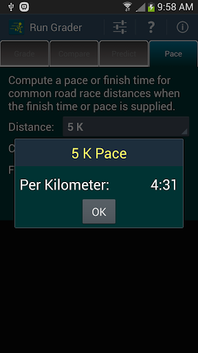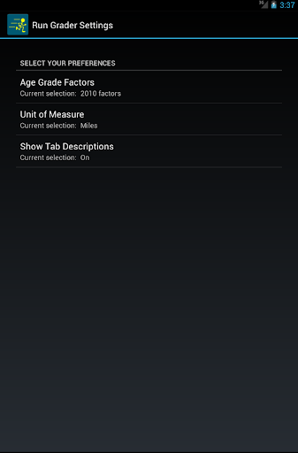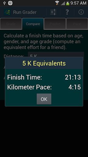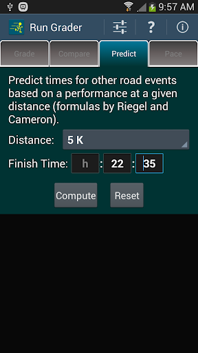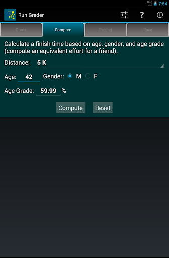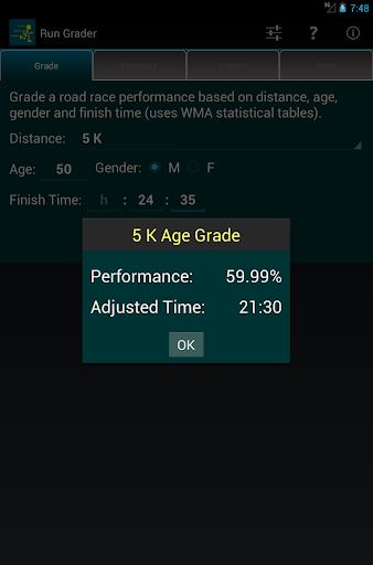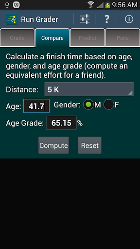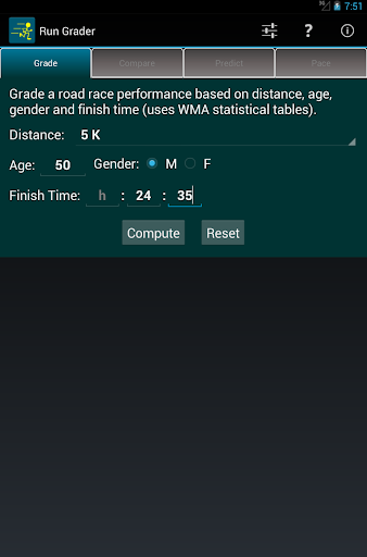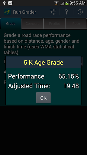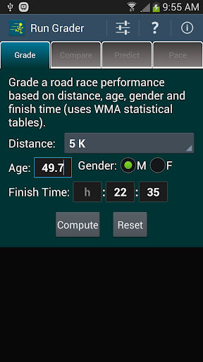 Compete against family and friends regardless of age or gender using this age-grade performance calculator that supports both miles and kilometers (configured in Settings). Determine whose run was really the best effort of the day. Choose from a list of popular road race distances from 5K to 200K, enter your age, gender and finish time, and the app will compute your age-graded performance (percent of world-record effort at the specified distance for your age and gender) and your finish time adjusted to an "open" division. Then quickly compute an equivalent finish time for another runner to determine who really "won" the race. Choose between three sets of WMA (World Masters Athletics) grading factors, 2006, 2010, or 2015 to align with the percentages you're accustomed to using. Note: The 2006 factors are the same ones used on the RW age-grading website.