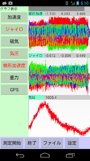 現時点では、センサーの情報の保存・読込み機能と、グラフ表示機能を持っています。グラフは、最大振れ幅にしたがって自動調整して表示されるため、大きな変化も小さな変化も、動的に調整して観察できます。しかし、観測値の目盛がないため、絶対値を知ることはできません。(今後の機能拡張をお待ちください。) センサーの測定値が、どのように変化するかを目で確かめて、何かを感じ取ってもらうことになります。例えば、加速度やジャイロの波が周期性を持たずに乱れていれば、無駄な動きをしていることがわかります。