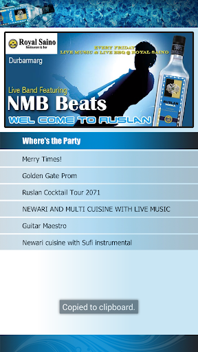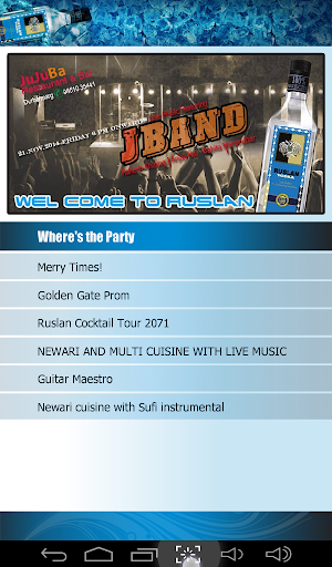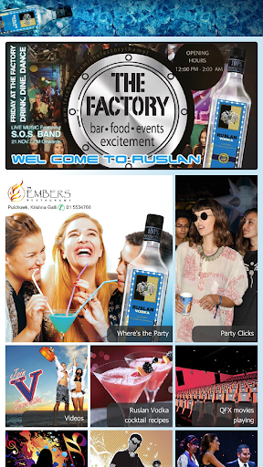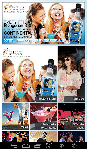 This is an information based application where events of Ruslan Vodka are listed. The notifications will be posted for the app users to be notified about the events in "Where's the Party" section. Event Pictures will be posted on the "Party Clicks" section.