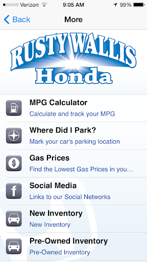 The Rusty Wallis Honda Loyalty Rewards mobile app is designed for customers of Rusty Wallis Honda in Dallas, TX. This app allows you to view and track your participation in the dealership's loyalty program and to view the service history of your vehicle. In addition, you are eligible for exclusive deals on service made available only to mobile app users!