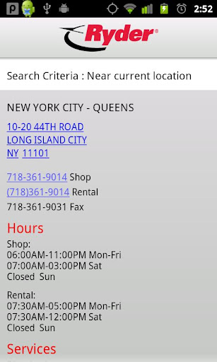 Get the official mobile application from Ryder® - for Android® devices! Looking for the nearest Ryder rental office? Searching for a maintenance facility? Want to refuel at a Ryder service station? Now, with just a touch, you can interact with a mobile app that brings you all the Ryder information you need. You can quickly search for and display nearby rental, maintenance and fueling locations. Find out about additional services offered at each location. Get instant access to 24/7 emergency roadside assistance – without having to search for a number. Whether you need to rent a truck, maintain your vehicle, refuel or get help when you’re out on the road, our easy-to-use facility locator points you to the most convenient location - or connects you with roadside assistance representatives. It’s another way Ryder provides our customers with top-line service, bottom-line savings and one-stop simplicity. Now accessible with just a touch.