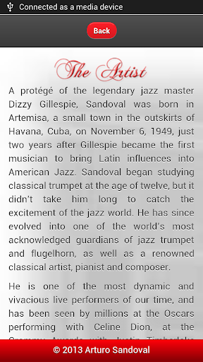 Arturo Sandoval began to play music at age 13 in the village band. After playing many instruments, he fell in love with the trumpet. In 1964, he began three years of serious classical trumpet studies at the Cuban National School of Arts. By the age of 16 he had earned a place in Cuba's all-star national band. By this time, he was totally immersed in jazz, with Dizzy Gillespie as his idol. In 1971 he was drafted into the military. Luckily, Sandoval was still able to play with the Orquesta Cubana de Musica Moderna. Because of this he was able to continue his daily practice regimen.