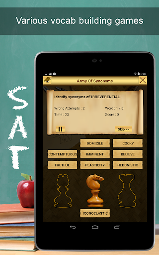 With SAT Prep Vocab Practice you can learn meaning, usage, synonyms, antonyms, origin and other important fields of SAT words. Increase your SAT Vocab while entertaining with interactive games and quizzes based on flashcards and mnemonic techniques. It also builds your english grammar basics while preparing for SAT questions.