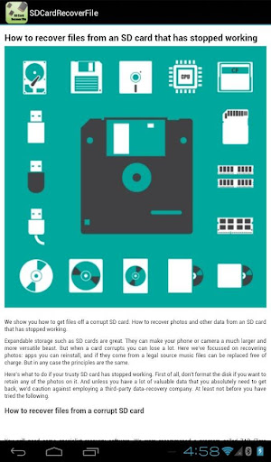 How to Restore Deleted Files on a SD Card?SD, or Secure Digital, cards are used to store and transfer information between digital cameras, mobile phones, Personal Digital Assistants (PDAs) and even small computers. The SD card is inserted into the side of the digital device and it stores pictures, ring tones, documents and contacts. There are a few different formats and sizes, including microSD, miniSD, and SDHC. Occasionally the cards crash or the user mistakenly deletes data. This article will show you how to restore deleted files on an SD card.Itâs happened to everyone. You drag some files to your Recycle Bin, and not thinking you empty the bin.Your important documents were in there.All may seem lost and deleted, but there are recovery programs available that can potentially recover your lost data bases from those files for you.Although it is just a GUIDE but it be very beneficial for you once you follow the steps mentioned inside it.They are under great risk of being lost for various ways. As ordinary people donât have habit to backup the important data, files and photos to computer, sometimes, you found data loss and this will be familiar. When such situation suddenly occurs, people would say I will send my card to a recovery shop. But you should know this is very expensive and time-consulting. The easiest way for recovering data on SD card is in this app already.App contents:- Use it as recover data app.- Use this app as data recovery software from SD card.- Now recover data from SD card with this free app.- You can also recover data from phone.- Data recovery from SD card is helped using this app.