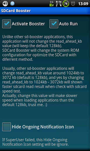 Unlike other simillar sd-booster applications, this application will not change the read_ahead_kb value (will keep the default 128kb). This SDCard Booster will change the system ROM configuration for optimize the SDCard with diferrent method.