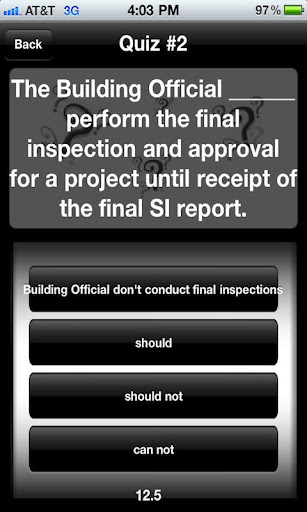 SI Admin is the fundamental knowledge for conducting Special Inspections. If your goal of using this application is for certification by ICC, you should be very familiar with every question in SI Admin’s quizzes. Each time you take a ICC certification, quiz your self several times as 4 to 10 questions from the Model Program for Special Inspections will be on your exam. Do not take the questions related to the Model Program lightly as one question could be the difference between pass or fail and that one question could be similar to questions asked in the quizzes in this app.