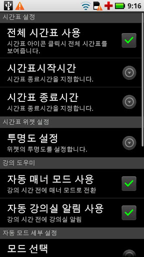 - Task killer를 사용하시는 분은 반드시 본 어플리케이션을 ignore 해주셔야 합니다. (자동 매너 모드/위젯이 정상작동 되지 않을 수 있습니다.)