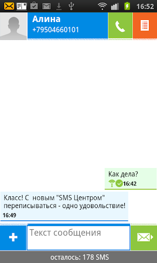 В «SMS Центр» реализован удобный и привычный интерфейс для пользователей android-смартфонов. Программа полностью интегрирована с системой Android (используется книга контактов, единая база SMS и т.д.